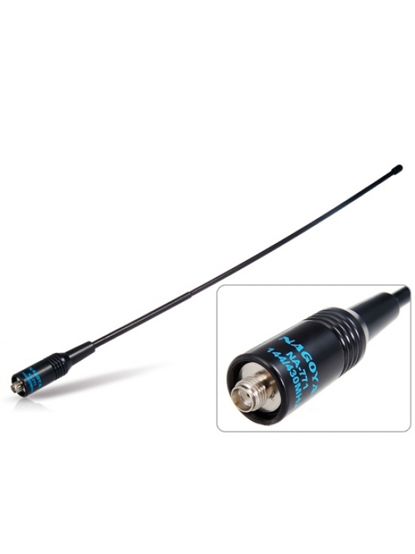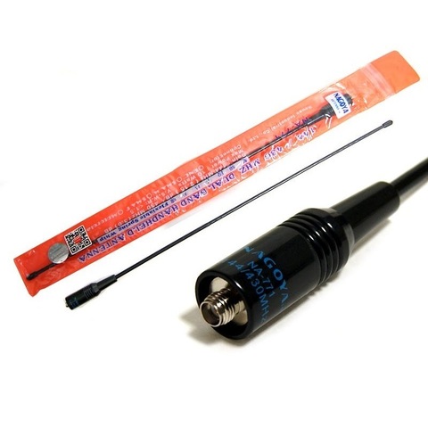 Антенна Nagoya NA-771 (M) – усиленная антенна, работающая на передачу в двух основных диапазонах 133-170 МГц(VHF) и 430-470 МГц МГц(UHF). Устройство используется для замены стандартной антенны и позволяет увеличить качество и дальность связи на 50%. Благодаря гибкому, но упругому стержню, антенна легко гнется и не ломается при падении рации. Герметичный корпус из качественных материалов и уплотнительное кольцо для разъема позволяют использовать антенну при любых погодных условиях.