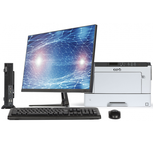 В комплект поставки АРМ DEPO Пересвет 110C12 входят: ультракомпактный компьютер, монитор диагональю от 23,8”" до 27”" на выбор, принтер DEPO или МФУ, а также клавиатура и мышь
