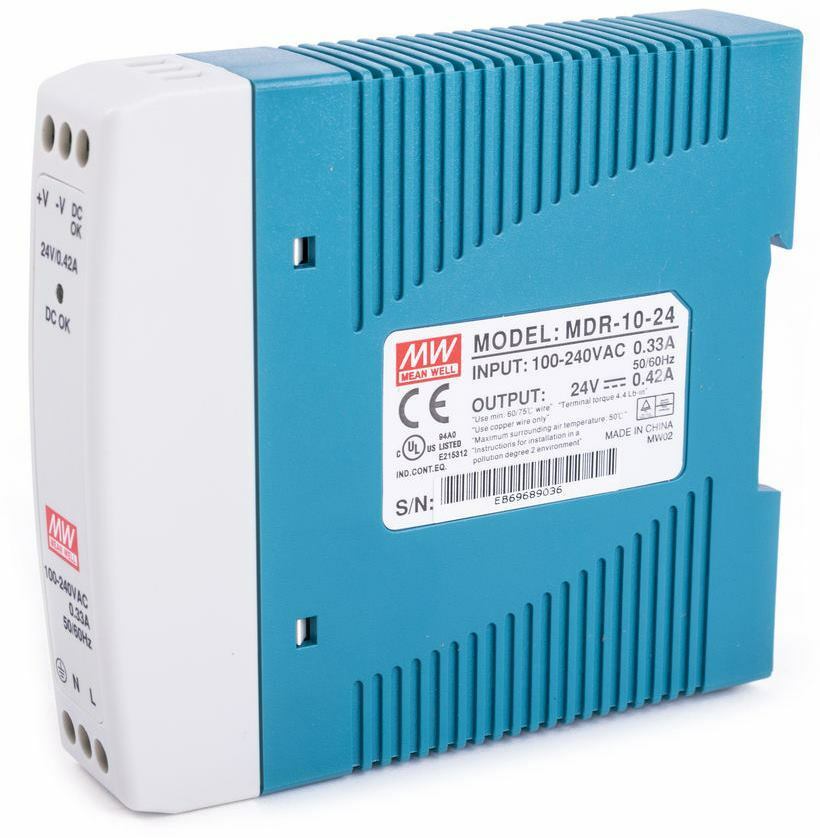 Источник питания MDR-10-24 предназначен для монтажа на DIN-рейку. ИП MDR-10-24 питается от однофазной сети переменного тока или от источника постоянного напряжения. Диапазон входных напряжений переменного тока ИП MDR-10-24 составляет от 85В до 264В частотой 47Гц...63Гц, или от 120В до 370В постоянного напряжения. MDR-10-24 имеет один выходной канал, выходное напряжение которого регулируемое в пределах ±10%. Электрическая прочность изоляции ИП MDR-10-24 составляет не менее 3000В, имеется защита от короткого замыкания и перенапряжения по выходным цепям, защита от перегрева, мягкий пуск с ограничением пускового тока, внутренний тест при включении. ИП MDR-10-24 имеет релейный выход сигнализации наличия напряжения на выходе (DC OK).