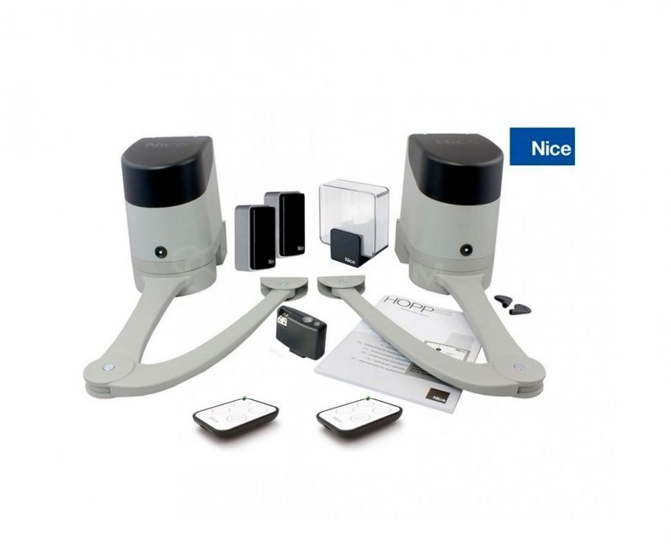 NICE HOPPВDKCE комплект для распашных ворот серии HOPP рычажного типа для автоматизации распашных ворот со створками шириной до 2,4 м и массой до 250 кг; интенсивность 80%, класс защиты IP54; диапазон рабочих температур от -20°С до +55°С; напряжение питания 220В; напряжение питания двигателя 24В; потребление 4А; тип привода рычажный электромеханический; интенсивность 35 циклов/час; габаритные размеры 252х180х290 мм.